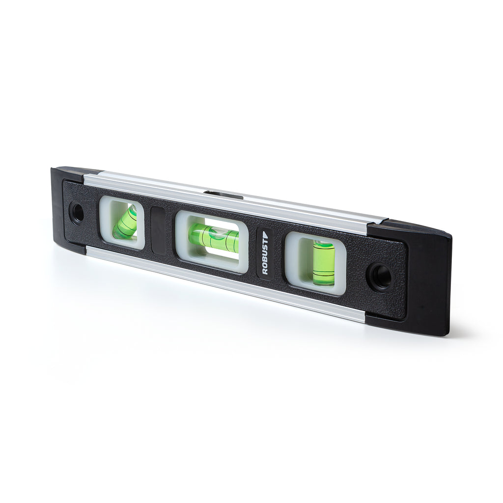 Nível com 3 bolhas para nivelar superfícies de 3 formas: horizontal, vertical e 45 graus.